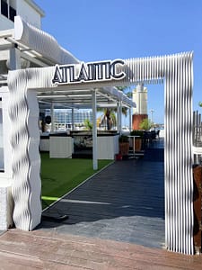 Neste projecto: Reclamo luminoso feito de PVC cortado em CNC e acrílico cortado a laser. Pórtico para o bar em parametric design feito de PVC fresado em CNC e acrílico cortado a laser. Estrutura metálica de serralharia para o tecto da esplanada do bar.